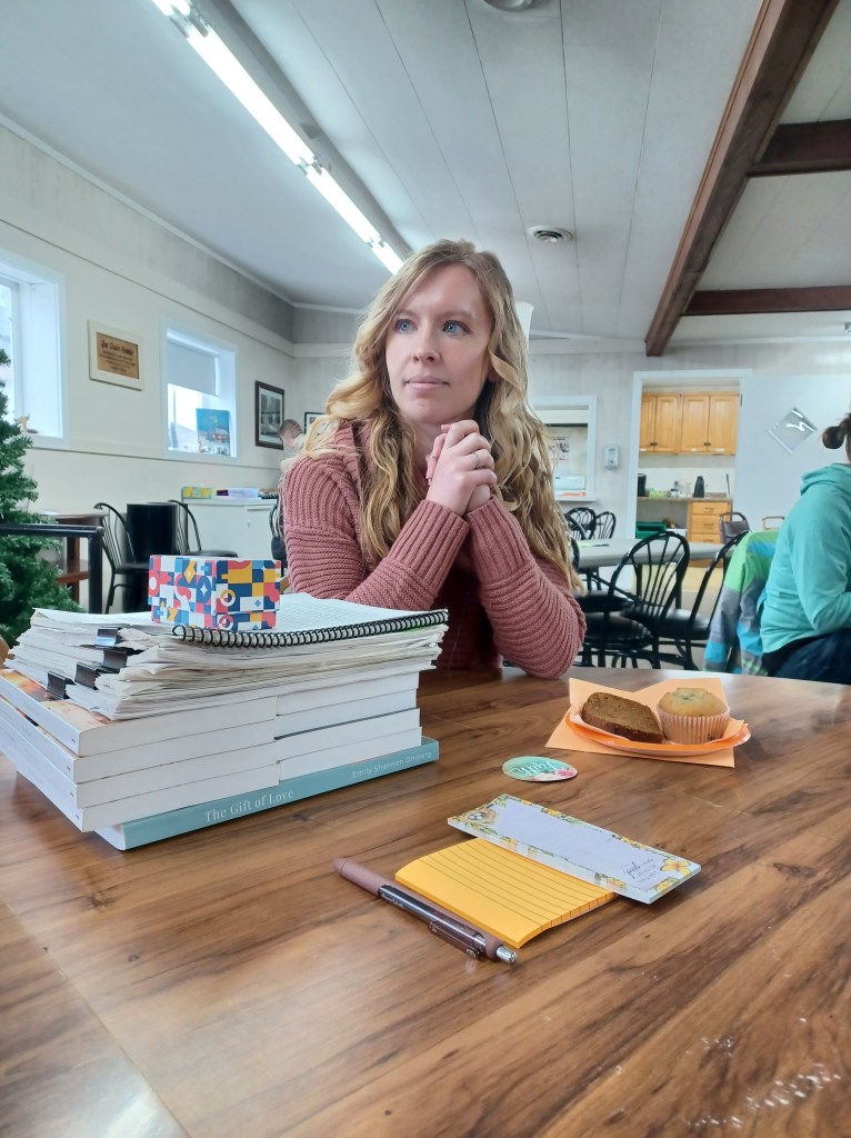 At 9:00, Marlene began the event with a song and a prayer. Then I was called forward to speak. I lugged my stack of books and my prepared script to the front of the room. I laughingly told the audience that I’m not the best public speaker and would try not to just read off my paper the entire time.